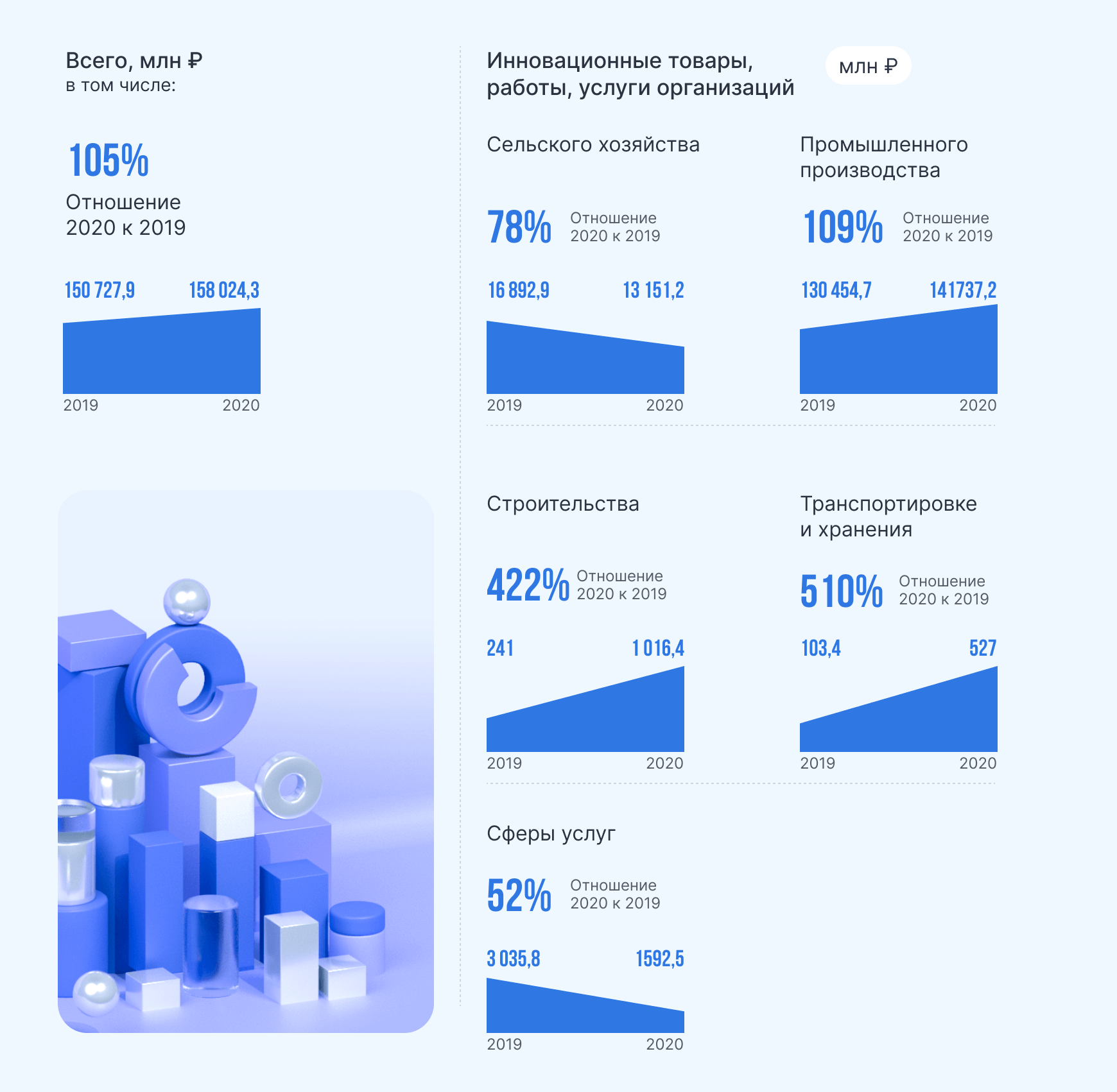 В 2020 году затраты на инновации сократились на 30% в сравнении в 2019 годом и составили 21540,9 млн рублей.