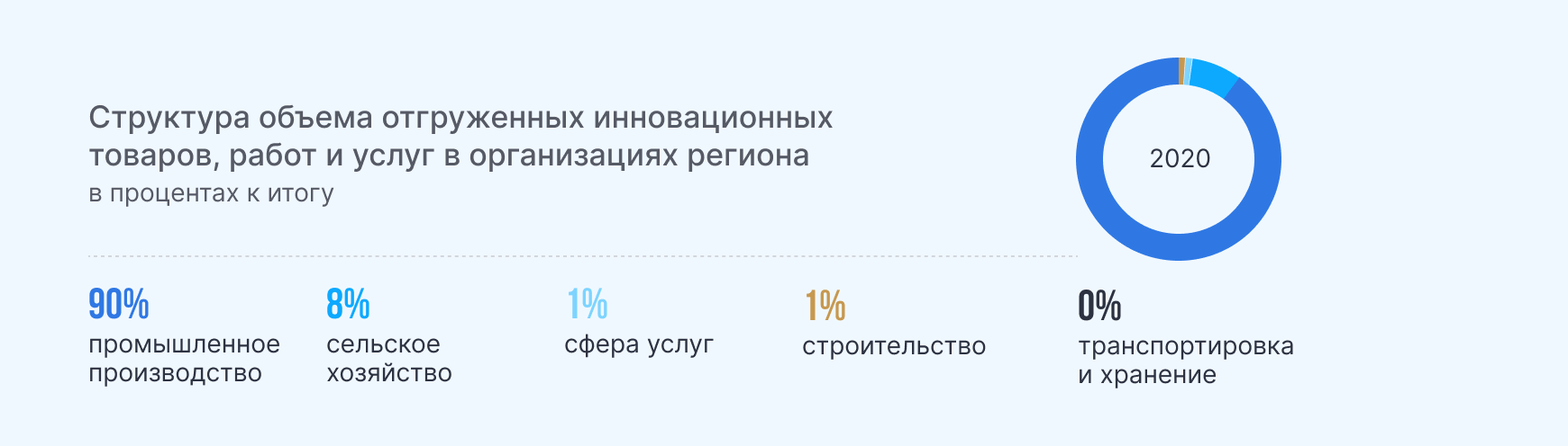 В структуре объема отгруженных инновационных товаров, работ и услуг 90% занимает инновационная продукция промышленного производства, 8% – сельского хозяйства.